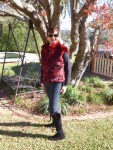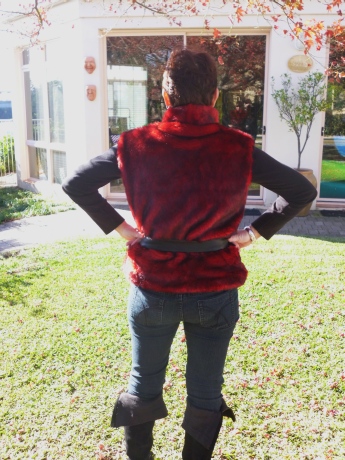 I decided that this was perfect for my fur vest. the pattern does not have much shape and as I have had to join the fur to get the length it is possibly not as sleek as it might otherwise be. Saying this though I still like it! It’s colorful,fun and warm. The pattern calls for the vest to have a belt, I am not sure I like the belt on it but I am using one I had. I didn’t want to make one. Sewing the fur is a challenge bigger stitches are required and slower speed because of the bulk. It wasn’t too hard ,another new experience.