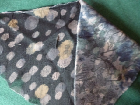 This has two different designs one side has autumn tones and flowers with lines, and the other with spots of varying sizes. that gave me two of the fabrics needed for the dress, and the other contrast was the fabric used in the jacket the sheer black .