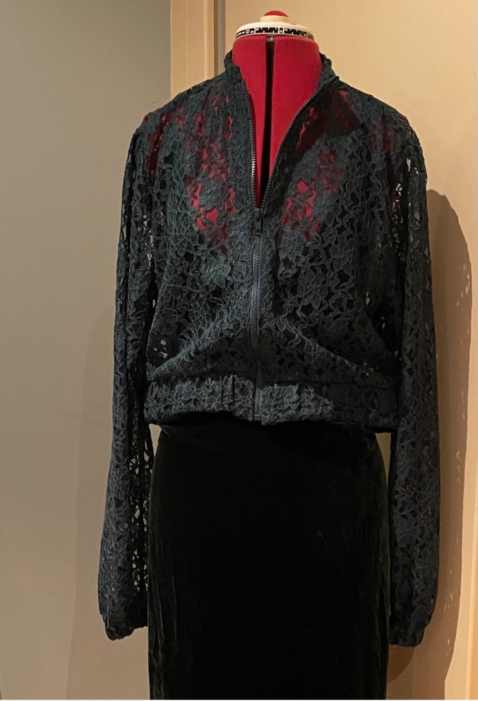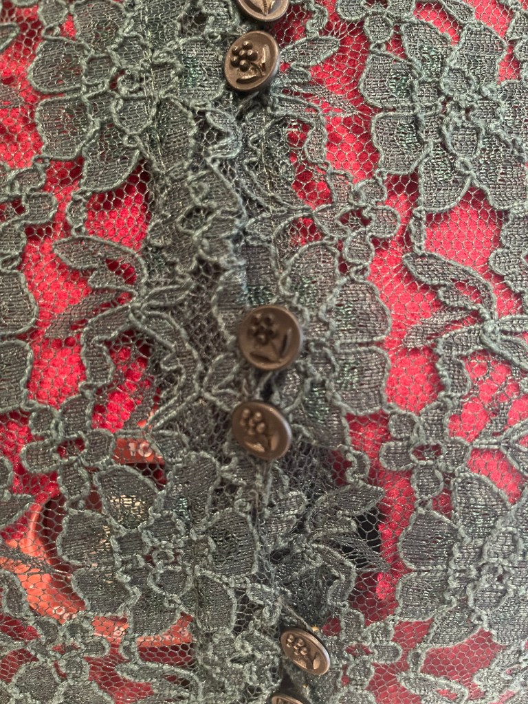 I made the long version self drafted with a split sleeve and side splits and used vintage glass buttons and thread loops to close it . As I like long tunic style tops, I have a self drafted pattern I use, (although now unless they have split sides I can’t really wear them sitting in my wheelchair). I am adding split sides to lots of previous makes these days, so that I can still wear them.
