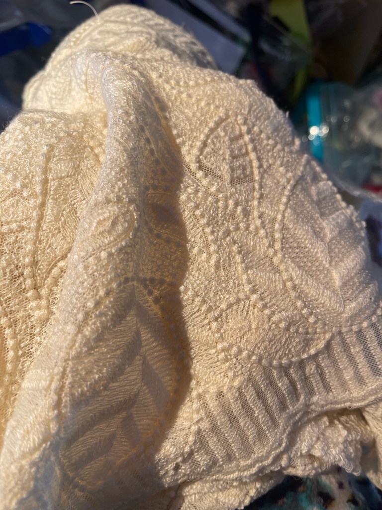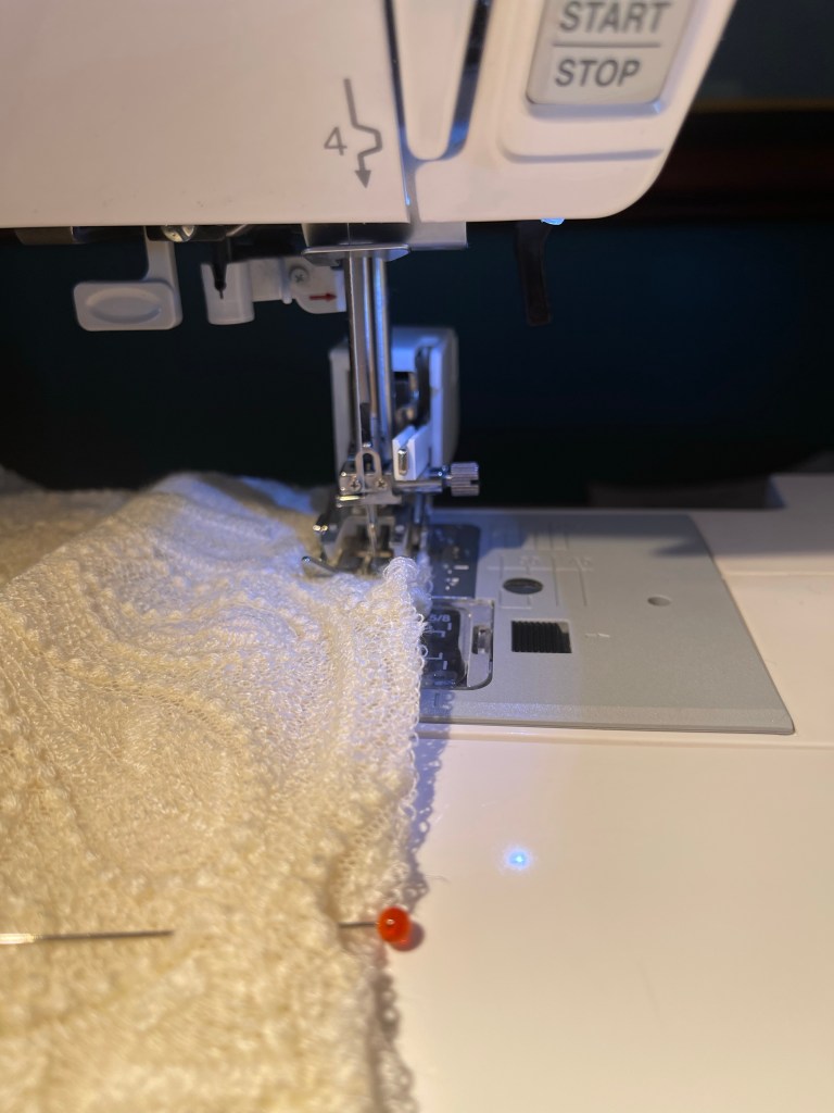 To start I asked a dear friend to trim the edges of the fabric to give me the clean scalloped edge. I can’t do fine cutting anymore my right hand fatigues to quickly. I thought that V1914 would work well with it.