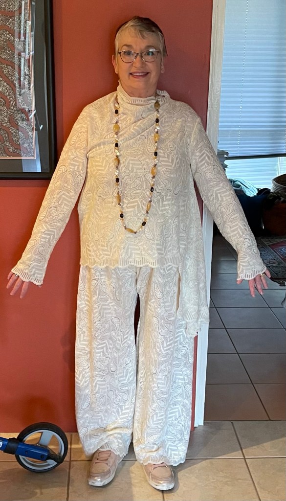 I had the scallop edge on the pants and sleeves , hem of the top and neck edge . I am braced against the wall for this picture to show the drape.
