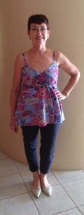 My next lot of sewing was done while on a little break. I took my daughter and some friends to our place on the beach at Avoca and while there I sewed up a storm. I made two tops from my collection that had been cut out before the start of the Fast. The first was in a lovely bright cotton that I had been really keen to make up . It is so comfortable and because the bodice is lined I can get away without wearing a bra under it a bonus in summer. The second is a pretty polyester I love the colours and it is cool and comfortable to wear.