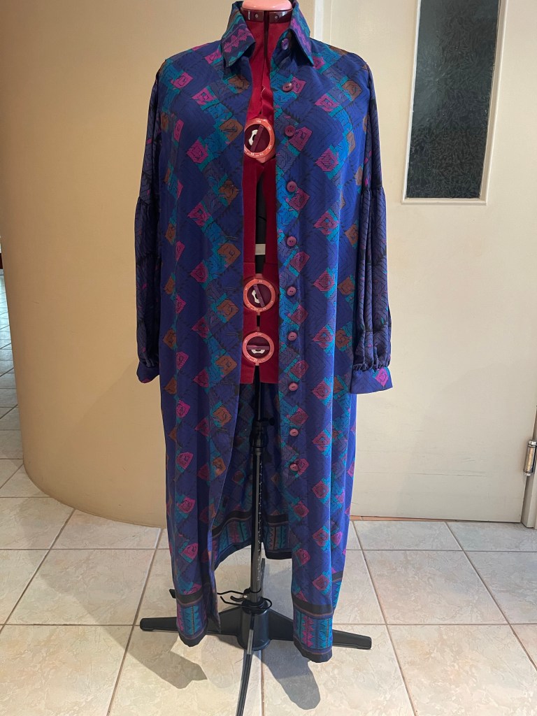 I made the long version self drafted with a split sleeve and side splits and used vintage glass buttons and thread loops to close it . As I like long tunic style tops, I have a self drafted pattern I use, (although now unless they have split sides I can’t really wear them sitting in my wheelchair). I am adding split sides to lots of previous makes these days, so that I can still wear them.